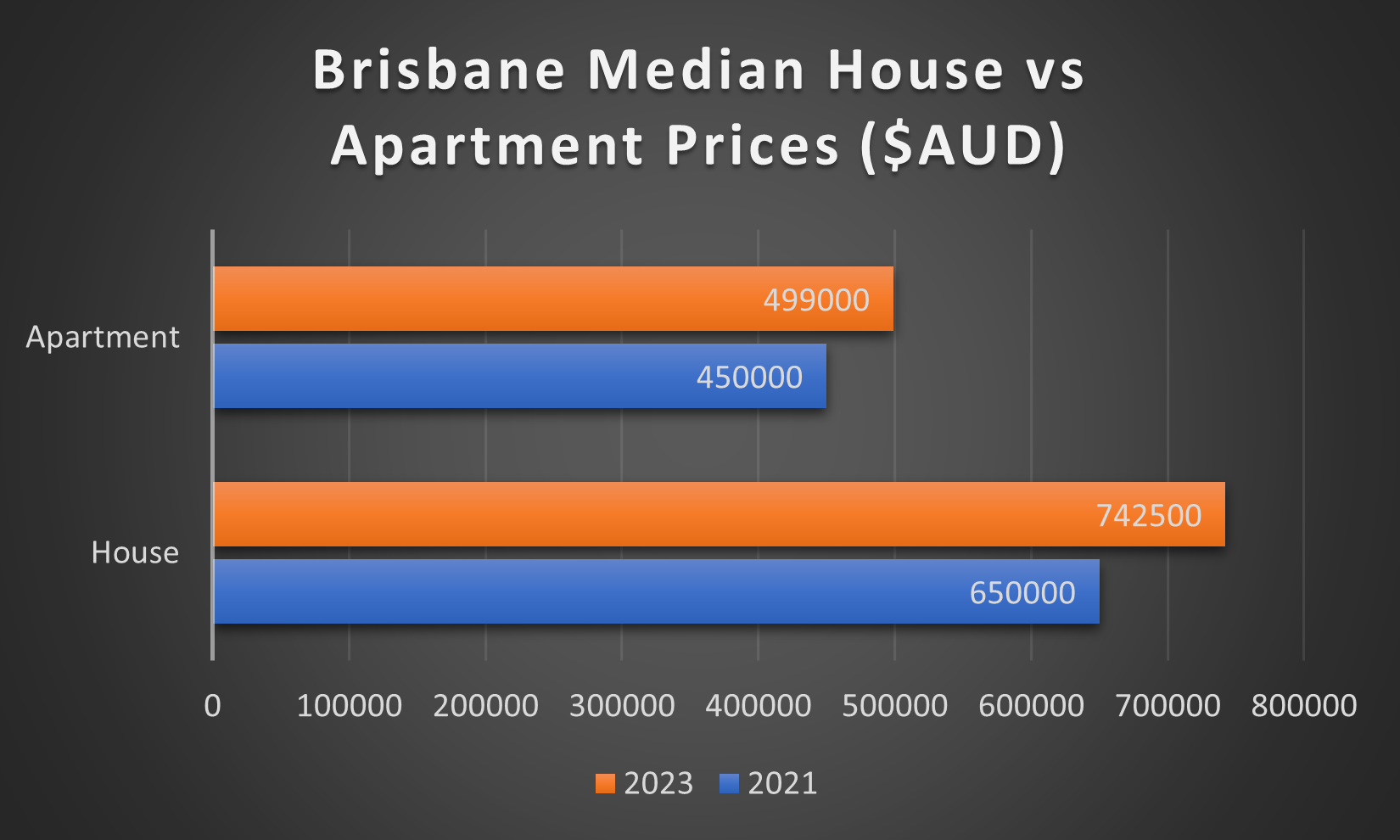 Brisbane had a nearly 15% increase in house prices, rising from $650,000 in 2021 to $742,500 in 2023. According to this article, Brisbane apartments increased by nearly 11% from $450,000 in 2021 to $499,000 in 2023.